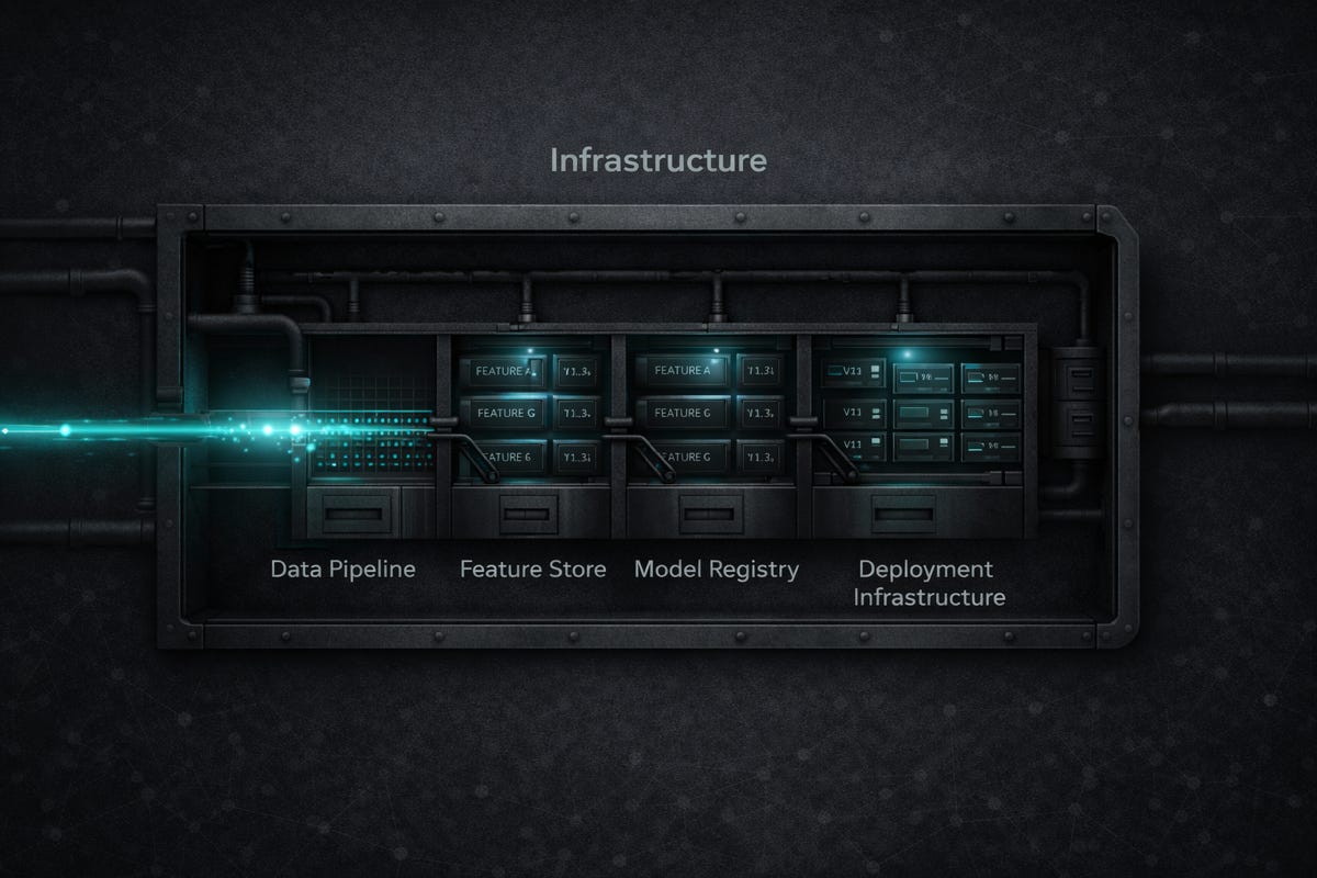 Traditional applications deploy code that runs predictably. ML systems deploy models that degrade over time as data patterns shift. That difference drives five additional infrastructure layers that manage model-specific complexity.